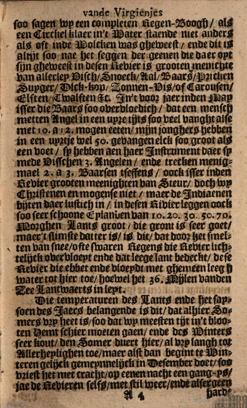 we saw a complete rainbow, like a half circle, appearing clearly in the water just as if it had been in the clouds, and this is always so according to the report of all who have ever been there. In this river is a great plenty of all kinds of fish — pike, shad, bass, etc. In the spring, in May, the perch are so plenty, that one man with a hook and line will catch in one hour as many as ten or twelve can eat. My boys have caught in an hour fifty, each a foot long. They have three hooks on the instrument with which they fish, and draw up frequently two or three perch at once. There is also in the [Hudson] river a great plenty of sturgeon, which we Christians do not like, but the Indians eat them greedily. In this river, too, are very beautiful islands, containing ten, twenty, thirty, fifty and seventy morgens of land. The soil is very good, but the worst of it is, that by the melting of the snow, or heavy rains, the river readily overflows and covers that low land. This river ebbs and flows at ordinary low water as far as this place, although it is thirty-six leagues inland from the sea.