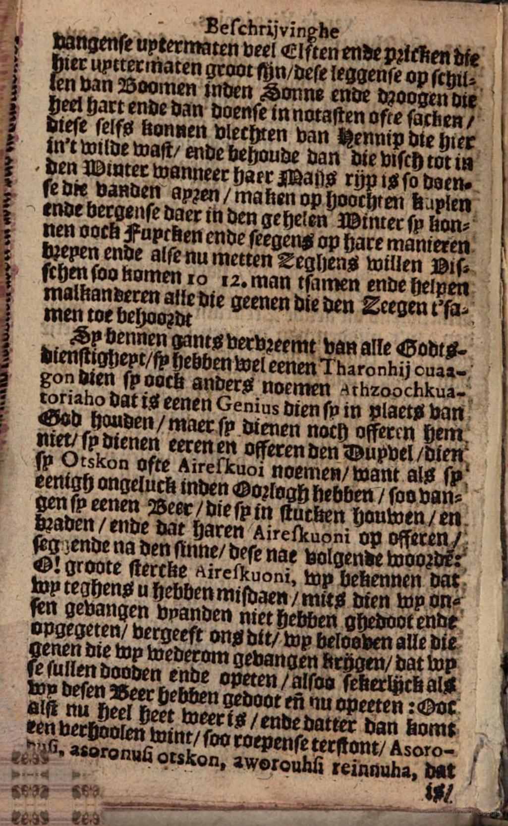 They are entire strangers to all religion, but they have a Tharonhijouaagon (whom they also otherwise call Athzoockkuatoriaho), that is, a Genius, whom they esteem in the place of God; but they do not serve him or make offerings to him. They worship and present offerings to the Devil, whom they call Otskon, or Aireskuoni. If they have any bad luck in war, they catch a bear, which they cut in pieces, and roast, and that they offer up to their Aireskuoni, saying in substance, the following words: "Oh! great and mighty Aireskuoni, we confess that we have offended against thee, inasmuch as we have not killed and eaten our captive enemies; forgive us this. We promise that we will kill and eat all the captives we shall hereafter take as certainly as we have killed, and now eat this bear." Also when the weather is very hot, and then comes a cooling breeze they cry out directly, Asoronusi, asoronusi, Otskon aworouhsi reinnuha; that is,
