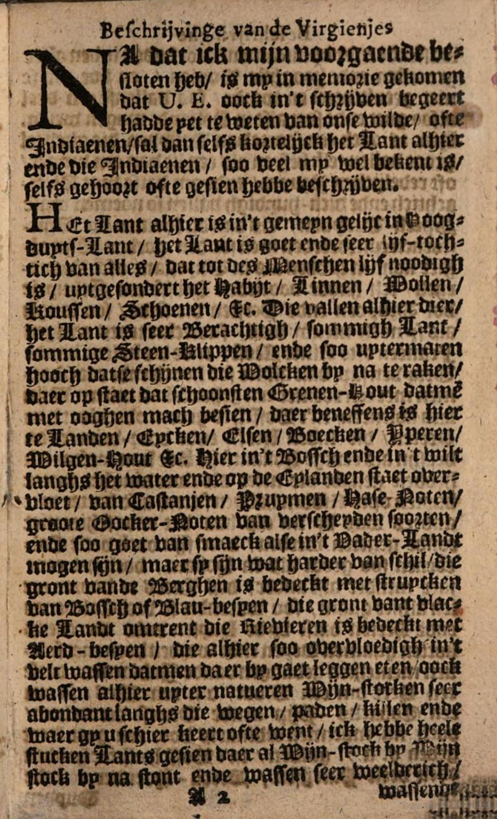 Nadat ik mijn voorgaende besloten heb ik mij in memorie gekomen dat U.E/. oock in't schrijven begeert hadde per te weten van onse wilde ofte Indiaenen sal van selfs kondighg het Lant alhier ende Indiaenen/so veel my wel bekent is selfs gehoort ofte gesien hebbe beschrijven.”