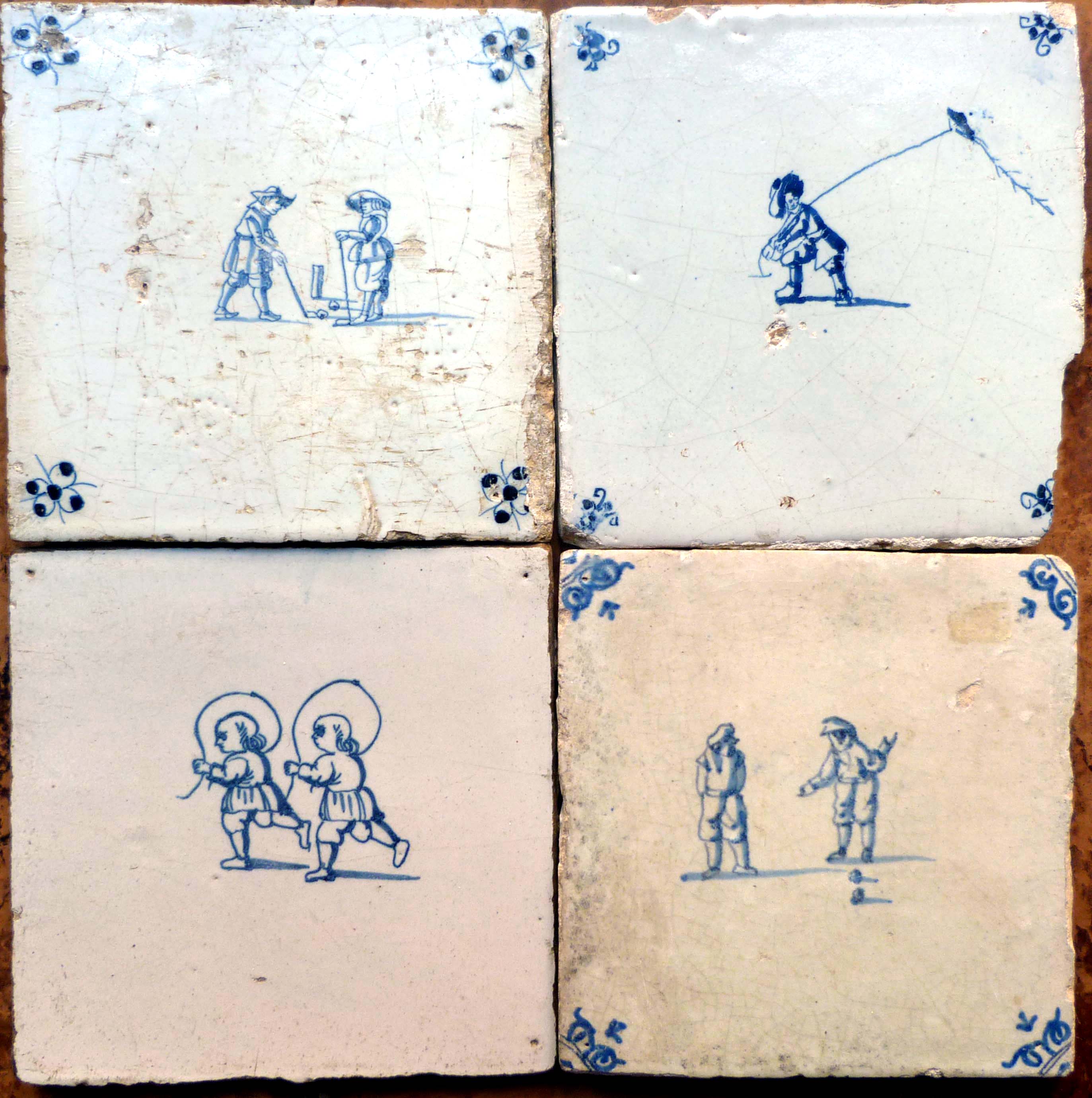 Dutch Delft blue tiles from the 17-century often depict lively scenes of children at play, offering a glimpse into daily life and happy street scenes with noisy children both in Holland and New Netherland. Painted in the characteristic cobalt blue on a white tin-glazed surface, these small ceramic tiles portray a wide variety of games and activities, as illustrated here—boys spinning tops, flying a kite, or playing gold [“colf”, or “beugelen” in Dutch], and girls skipping rope.